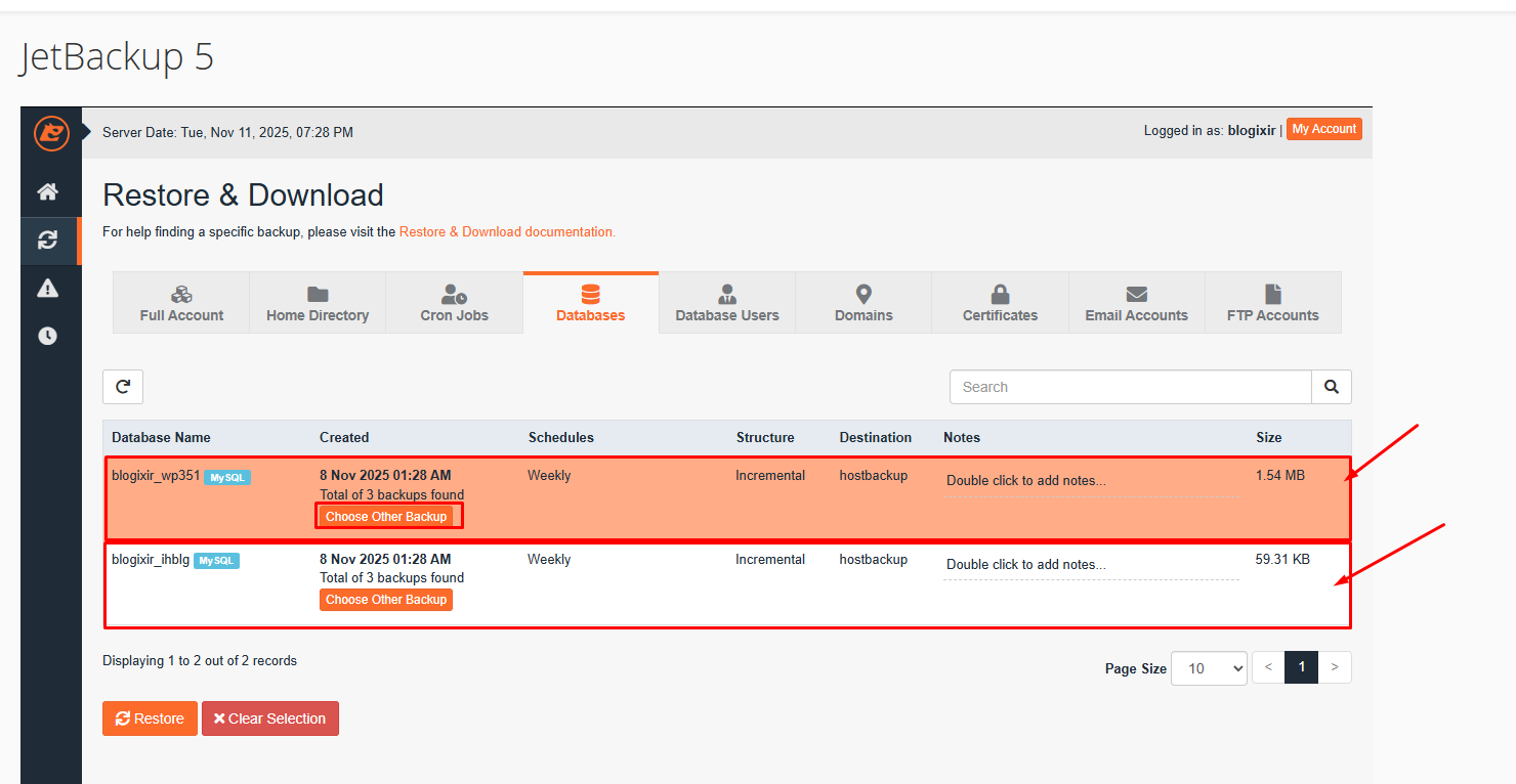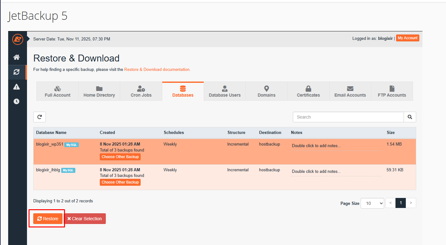 JetBackup veritabanını geri yüklemeye başlar ve birkaç saniye ile birkaç dakika arasında tamamlanır (veritabanının boyutuna bağlı).