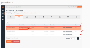 JetBackup’te mevcut yedeklemeler listelenir.