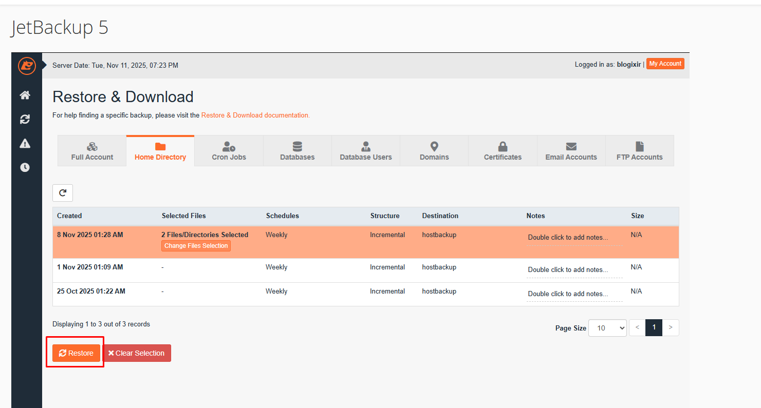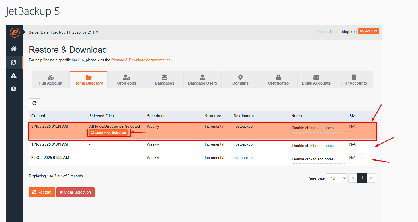 JetBackup genellikle birkaç geri yükleme seçeneği sunar: