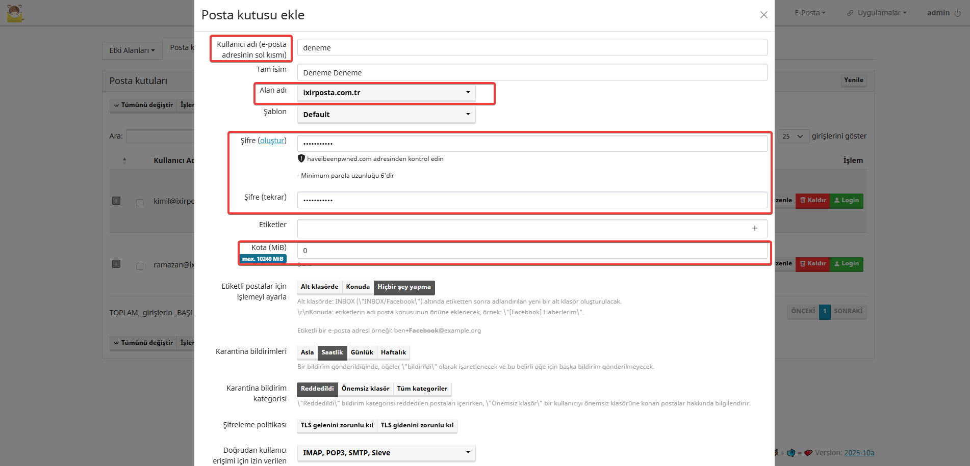 Kullanıcı adı: Mail kullanıcı adı (örnek: info)